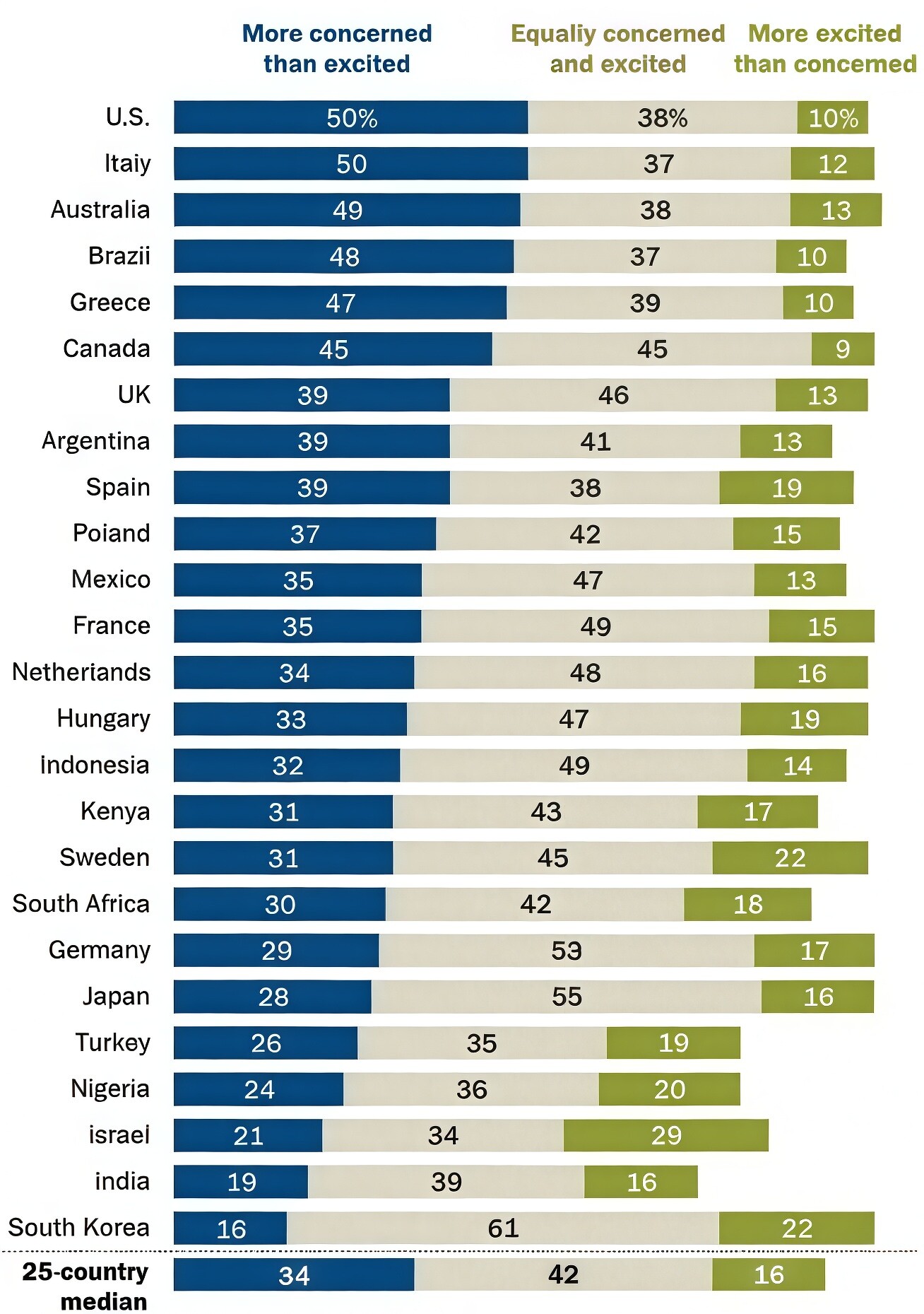 По данным Pew Research Center, (50% опрошенных) американцев и итальянцев скорее обеспокоены, чем воодушевлены» активным распространением ИИ-технологий в повседневной жизни. Многие обеспокоены распространением ИИ также в Австралии (49%), Бразилии (48%), Греции (47%) и Канаде (45%). Меньше всего беспокоятся по этому поводу жители Южной Кореи (16%) и Индии (19%). Наибольшее воодушевление по поводу ИИ выразили в Израиле (29%), Южной Корее и Швеции (по 22%), а также Нигерии (20%).